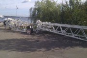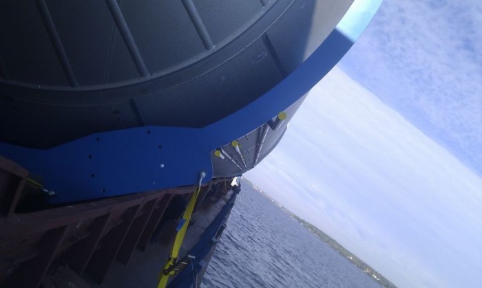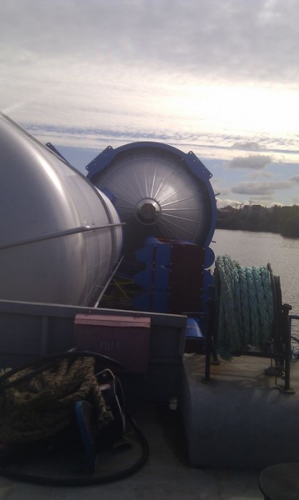 Перевозка пивных танков из Санкт-Петербурга в Болтино сухогрузом «Окский-70». Негабаритный груз, диаметр танков достигал 8 метров. В связи с этим возникали сложности с управлением судном, так как обзор из капитанской рубки был практически нулевым. Для решения этой проблемы была установлена будка для впередсмотрящего, который помогал капитану. Август 2012 года.